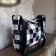 Capiente Tote bag realizzata in velluto bianco e nero a disegni geometrici doppiata in velluto liscio nero con cui sono stati realizzati i manici, la tracolla e il profili a contrasto.